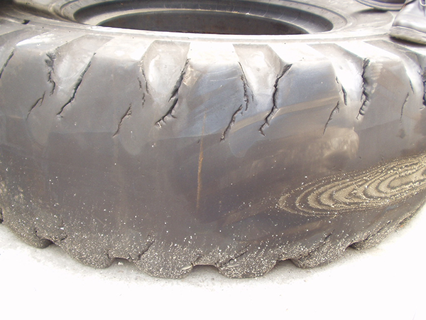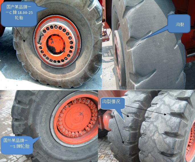 ?高負(fù)荷、低速速、頻繁轉(zhuǎn)向,輪胎與路面間產(chǎn)生很大的摩擦力,導(dǎo)致正面吊前輪會(huì)出現(xiàn)花紋端點(diǎn)裂口、后輪會(huì)出現(xiàn)花紋基本裂口,這是正?,F(xiàn)象。
